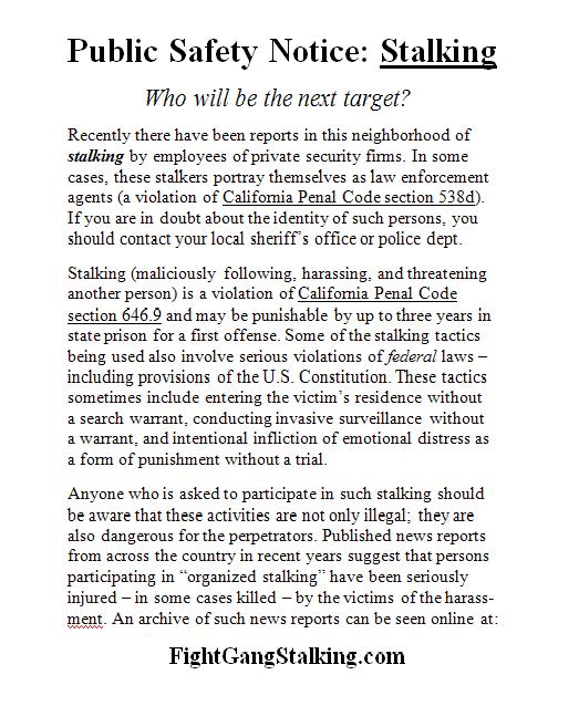 No one in the U.S. Department of Justice (DOJ) – one of America’s 17 federal intelligence agencies – ever publicly discusses counterintelligence stalking. Similarly, corporate executives, private security firms, and local police officials are unlikely to publicly discuss their involvement in organized stalking crimes. Victims, however, can distribute flyers (see the July 4, 2015 post below for a template) which are so disruptive that they generate news reports. Those news reports create problems for the criminals and their bosses. 🙂